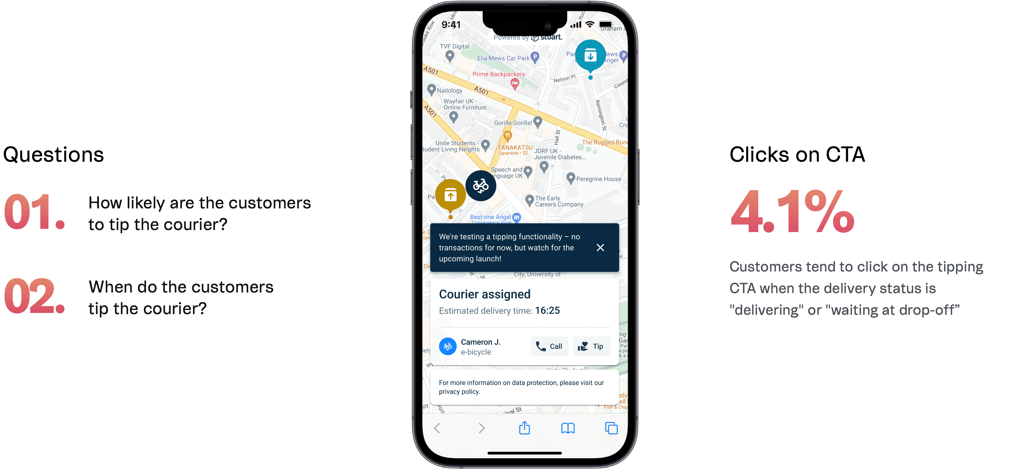 Tipping involves a two-part process: first, the customer tips the courier, and second, the courier is informed about the tip. It's crucial that couriers are informed as quickly as possible, as real-time updates are essential for testing whether tipping can influence their behaviour—particularly when it comes to decisions like moving from one delivery zone to another.