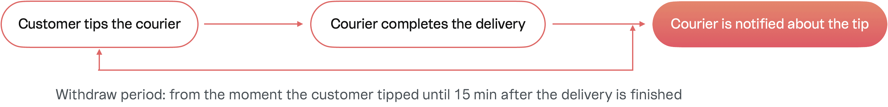 After the customer tips the courier and the delivery is completed, there is a 15-minute gap before the courier is notified about the tip. This delay is based on my analysis of how long customers remain active on the page post-delivery, allowing for a tipping withdrawal period that ensures accurate and timely notifications for couriers.